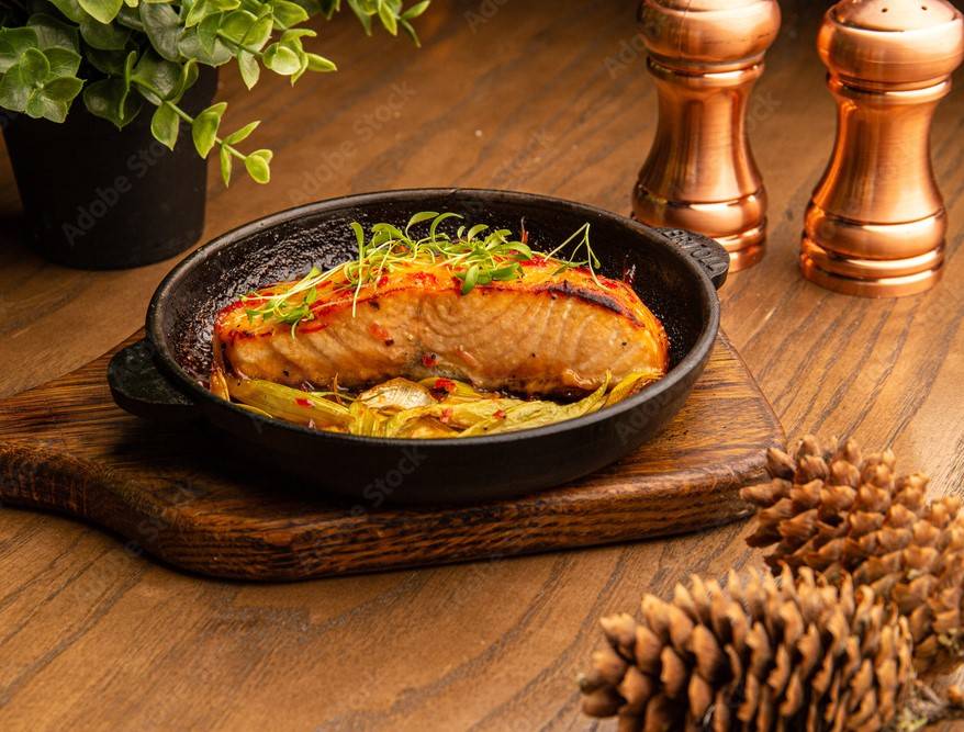 Dos de Saumon Poêlé à l'Huile d'olive, sel, poivre et d'autres épices dont nous gardons le secret.
